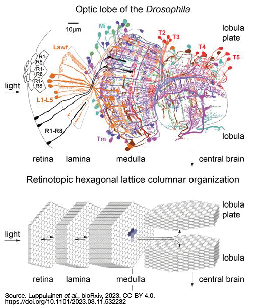 To illustrate how this might be accomplished, we will interface NeuroMechFly a recently established connectome-constrained neural network model (Lappalainen et al., 2023; code). This study has constructed an artificial neural network (ANN) representing the retina, lamina, medulla, lobula plate, and lobula of the fly visual system (see figure below). The connectivity in this network is informed by the connectome and, unlike typical ANNs, models biologically meaningful variables such as voltage.